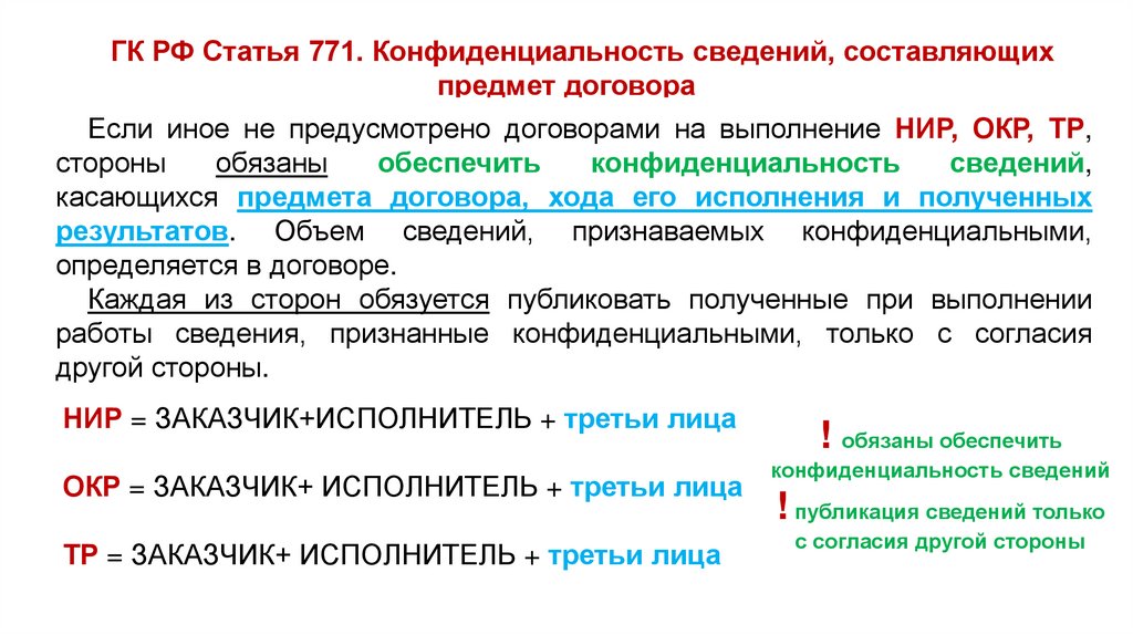 ГК РФ Статья 771. Конфиденциальность сведений, составляющихпредмет договора