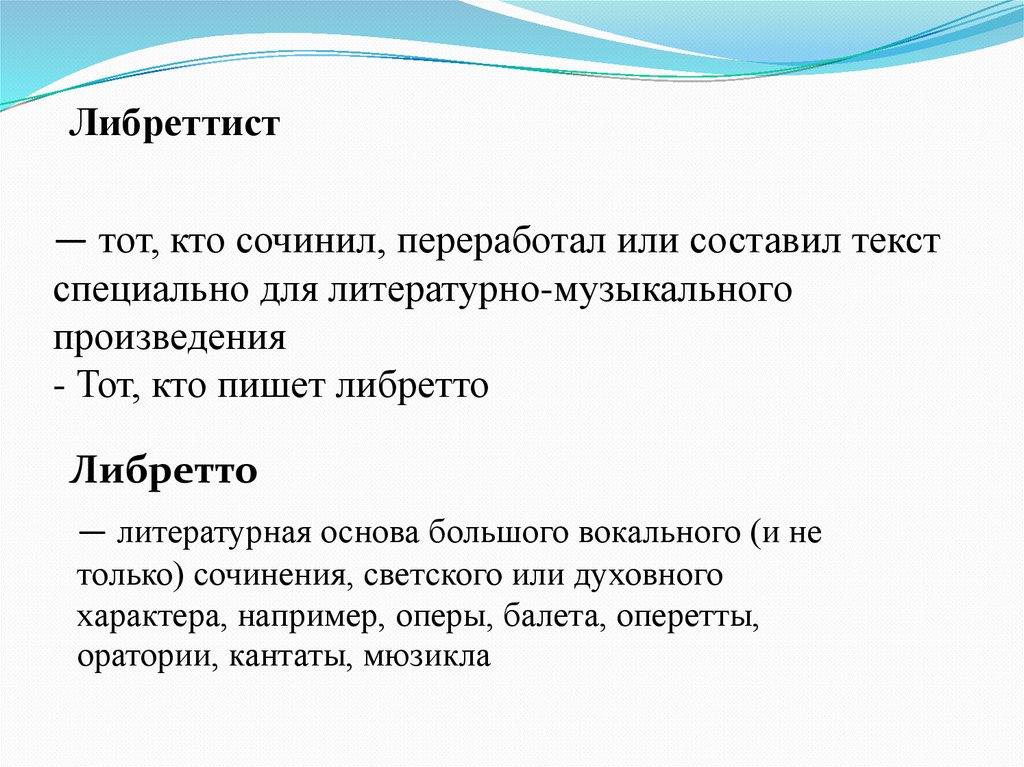 Либреттист— тот, кто сочинил, переработал или составил текст