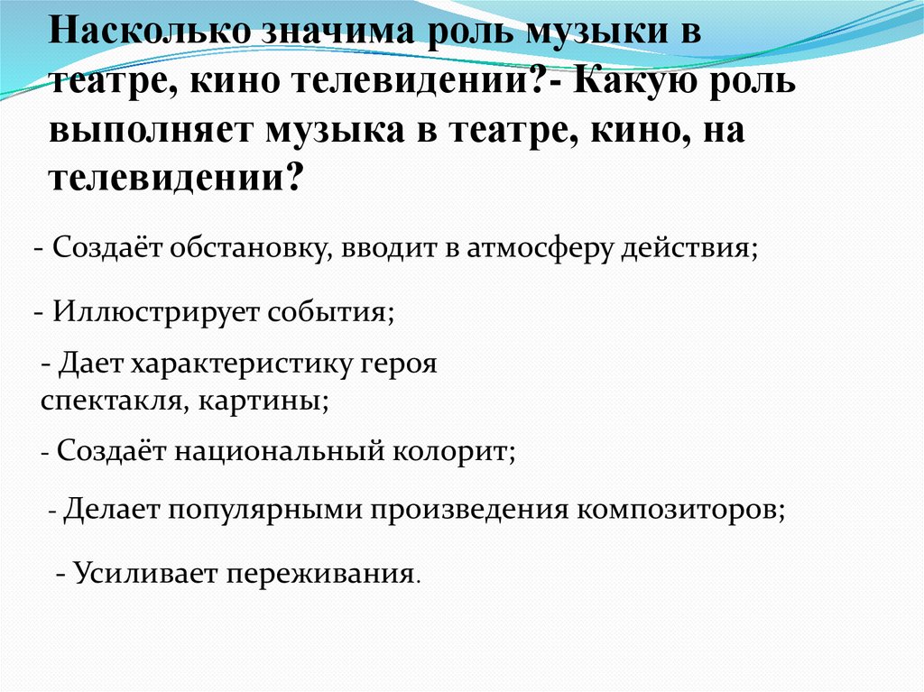 Насколько значима роль музыки втеатре, кино телевидении?- Какую роль