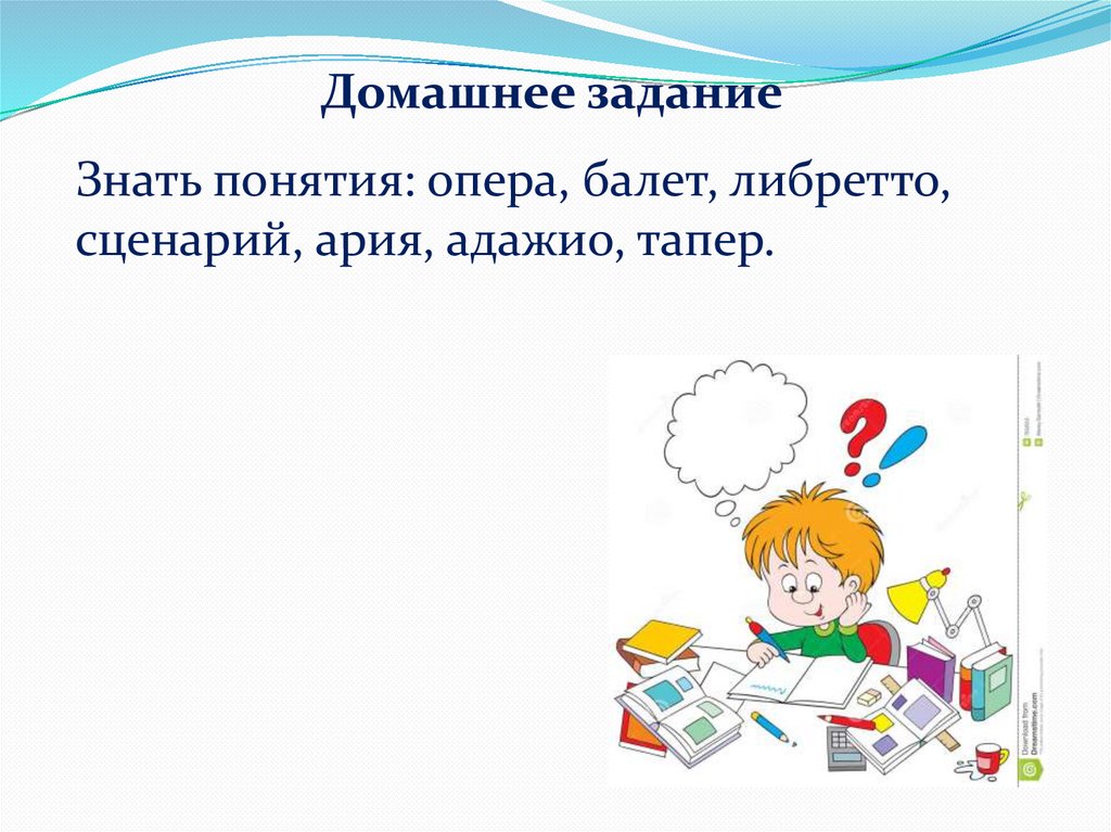 Домашнее заданиеЗнать понятия: опера, балет, либретто,