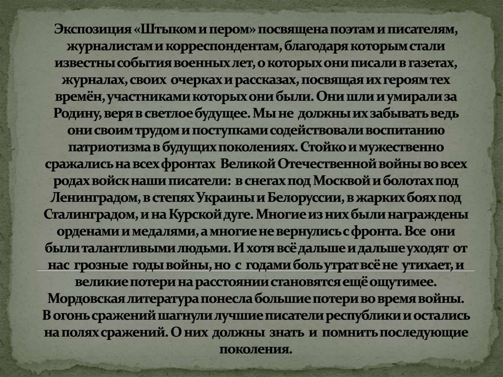 Экспозиция «Штыком и пером» посвящена поэтам и писателям, журналистам и корреспондентам, благодаря которым стали известны