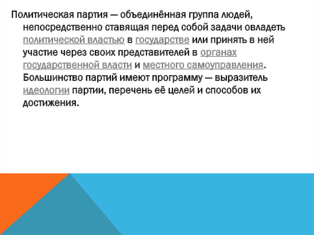 Политическая партия — объединённая группа людей,непосредственно ставящая перед собой задачи овладеть