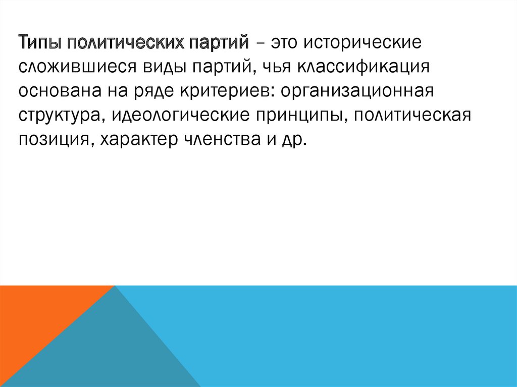 Типы политических партий – это историческиесложившиеся виды партий, чья классификация