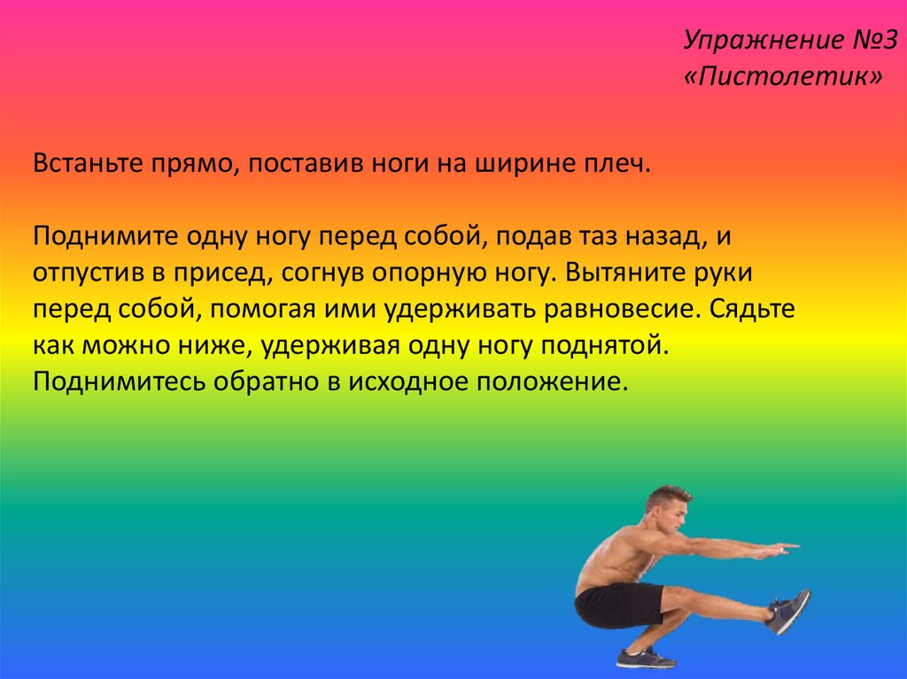 отпустив в присед, согнув опорную ногу. Вытяните руки