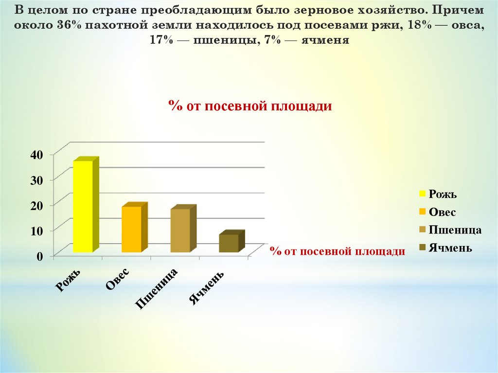 В целом по стране преобладающим было зерновое хозяйство. Причемоколо 36% пахотной земли находилось под посевами ржи, 18% — овса,