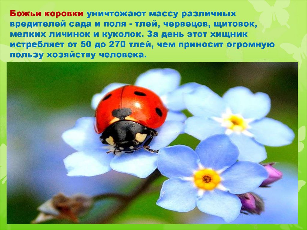 Божьи коровки уничтожают массу различныхвредителей сада и поля - тлей, червецов, щитовок,