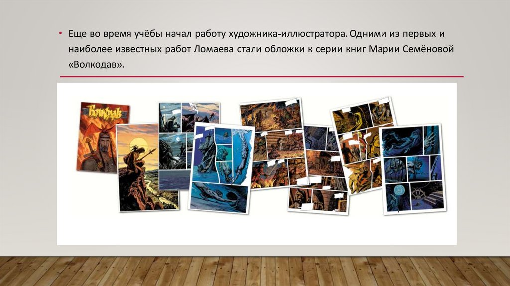 • Еще во время учёбы начал работу художника-иллюстратора. Одними из первых инаиболее известных работ Ломаева стали обложки к серии книг Марии Семёновой