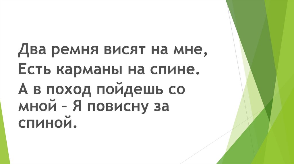 Два ремня висят на мне,Есть карманы на спине.