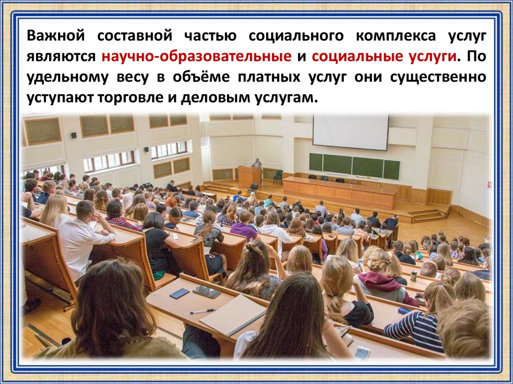 Важной составной частью социального комплекса услугявляются научно-образовательные и социальные услуги. По