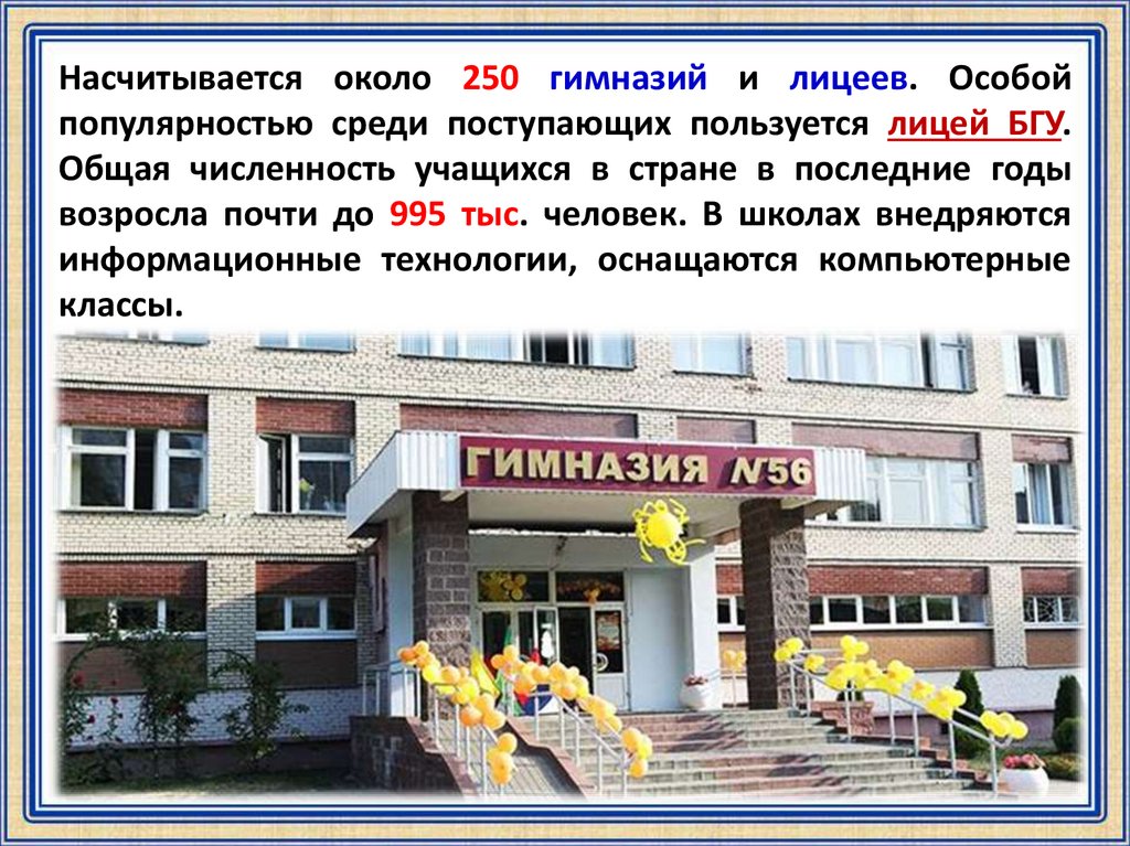 Насчитывается около 250 гимназий и лицеев. Особойпопулярностью среди поступающих пользуется лицей БГУ.