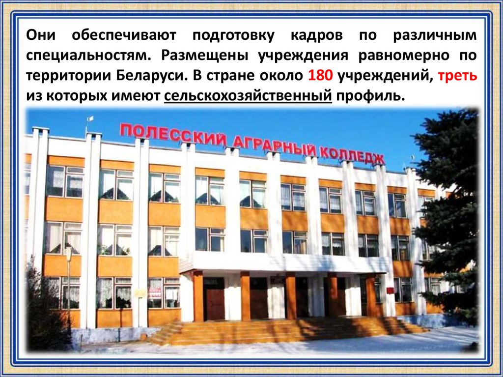 Они обеспечивают подготовку кадров по различнымспециальностям. Размещены учреждения равномерно по