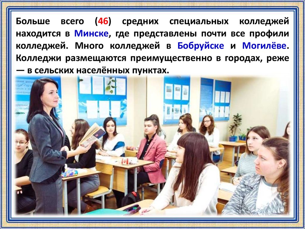 Больше всего (46) средних специальных колледжейнаходится в Минске, где представлены почти все профили