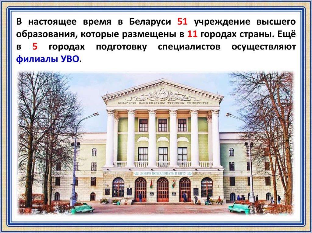 В настоящее время в Беларуси 51 учреждение высшегообразования, которые размещены в 11 городах страны. Ещё