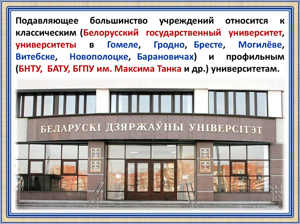 Подавляющее большинство учреждений относится кклассическим (Белорусский государственный университет,