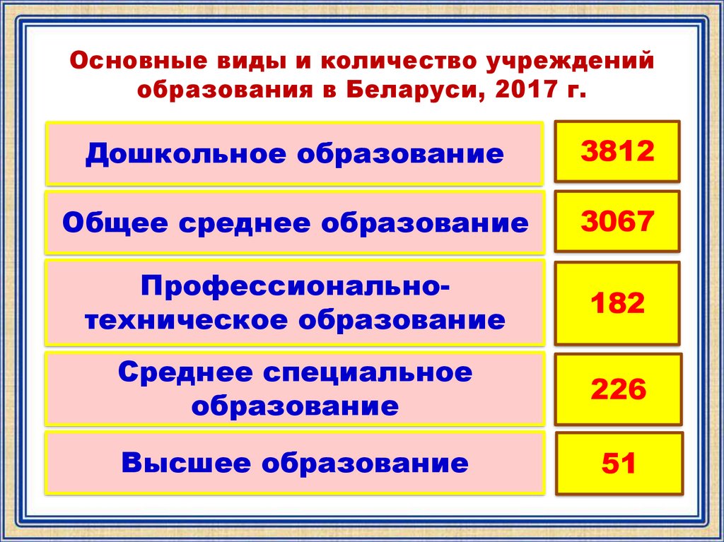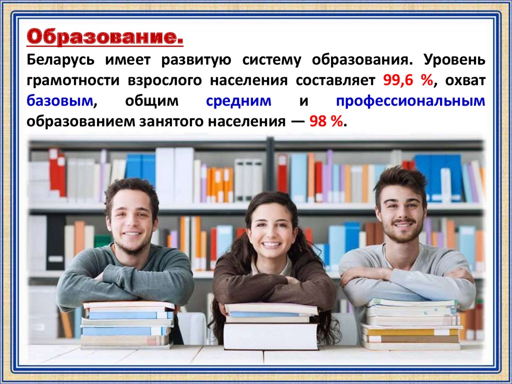 Образование.Беларусь имеет развитую систему образования. Уровень