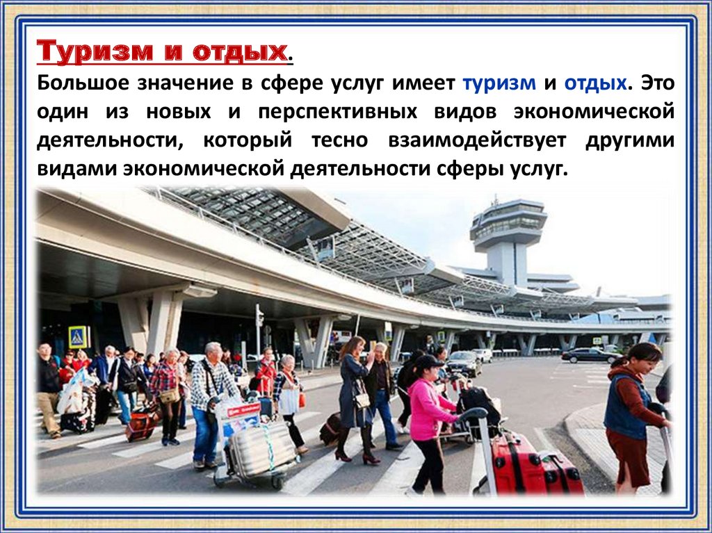 Туризм и отдых.Большое значение в сфере услуг имеет туризм и отдых. Это