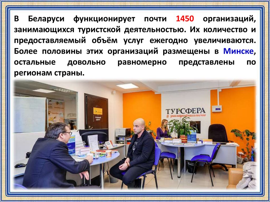 В Беларуси функционирует почти 1450 организаций,занимающихся туристской деятельностью. Их количество и