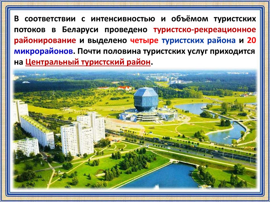 В соответствии с интенсивностью и объёмом туристскихпотоков в Беларуси проведено туристско-рекреационное