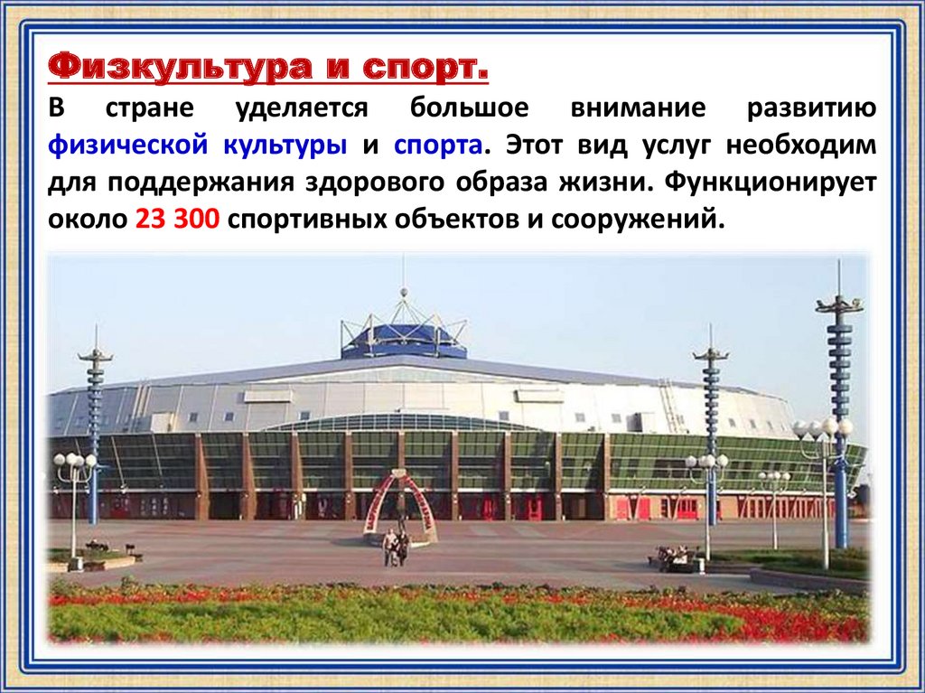 Физкультура и спорт.В стране уделяется большое внимание развитию