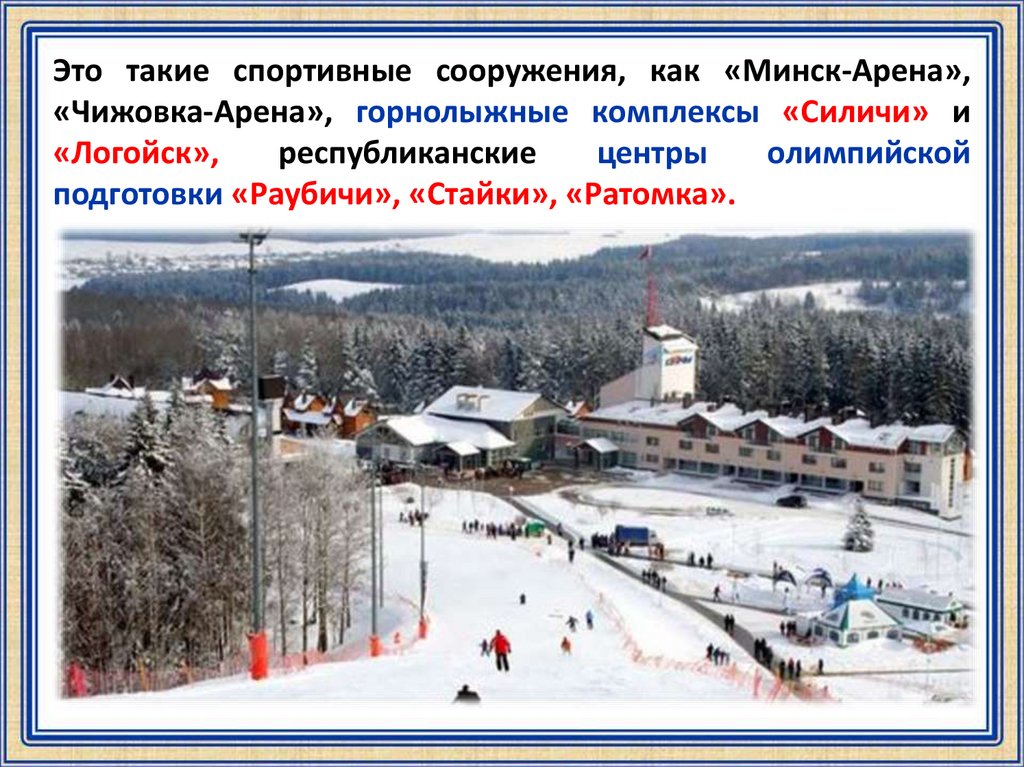 Это такие спортивные сооружения, как «Минск-Арена»,«Чижовка-Арена», горнолыжные комплексы «Силичи» и