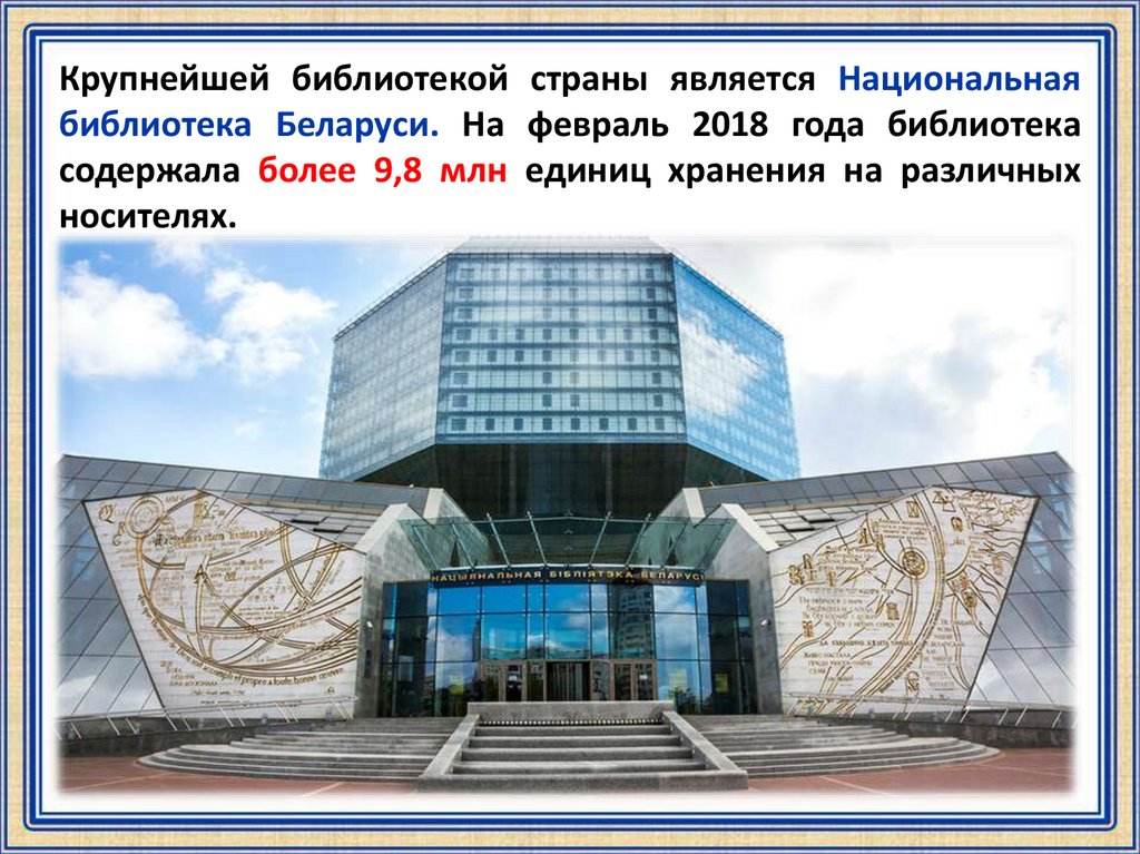 Крупнейшей библиотекой страны является Национальнаябиблиотека Беларуси. На февраль 2018 года библиотека