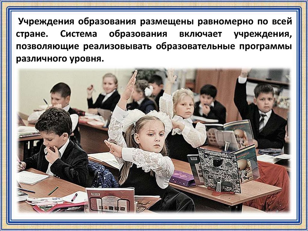 Учреждения образования размещены равномерно по всейстране. Система образования включает учреждения,