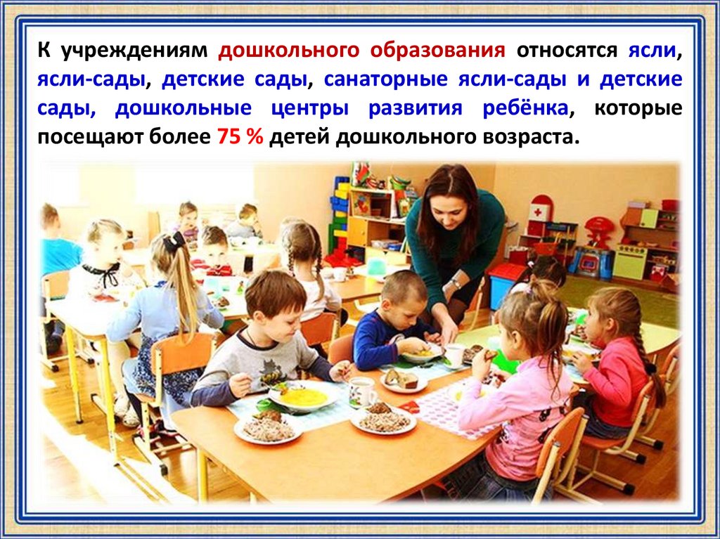 К учреждениям дошкольного образования относятся ясли,ясли-сады, детские сады, санаторные ясли-сады и детские