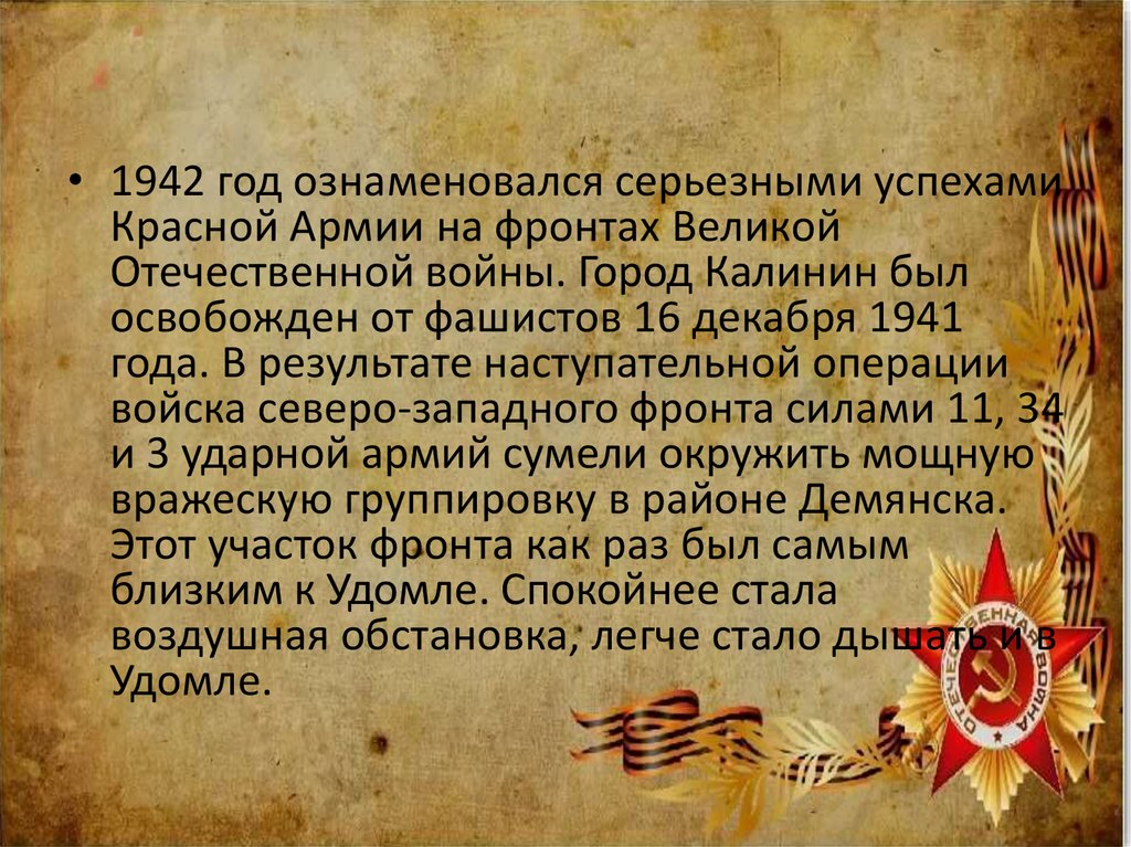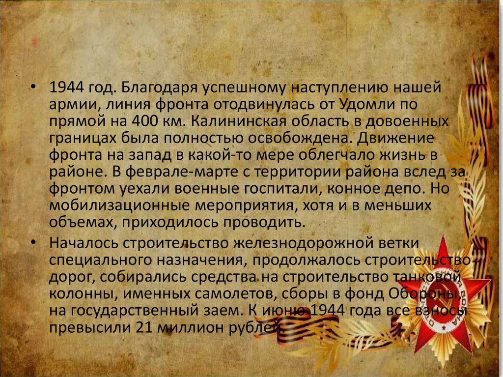 • 1944 год. Благодаря успешному наступлению нашейармии, линия фронта отодвинулась от Удомли по