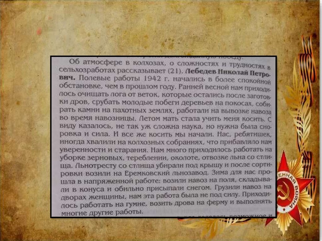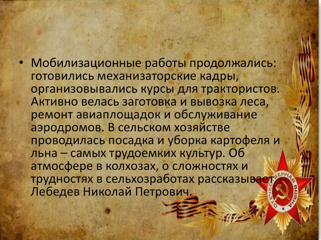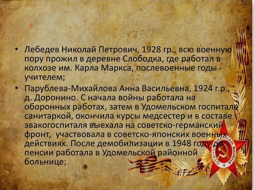 • Лебедев Николай Петрович, 1928 гр., всю военнуюпору прожил в деревне Слободка, где работал в
