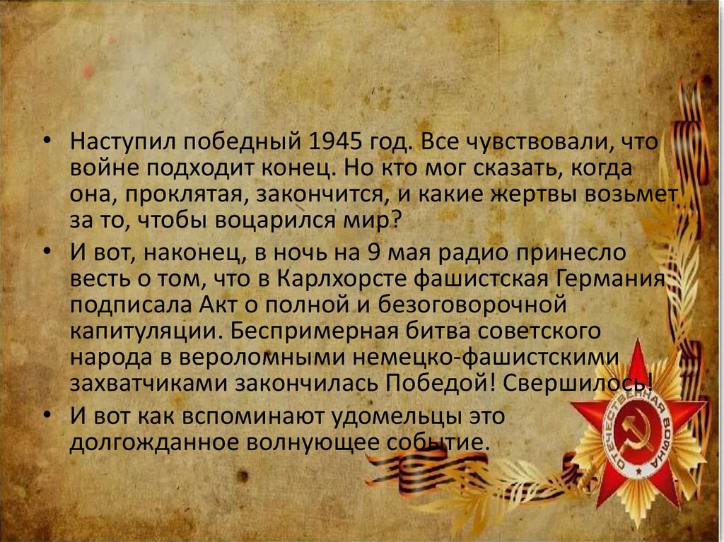• Наступил победный 1945 год. Все чувствовали, чтовойне подходит конец. Но кто мог сказать, когда