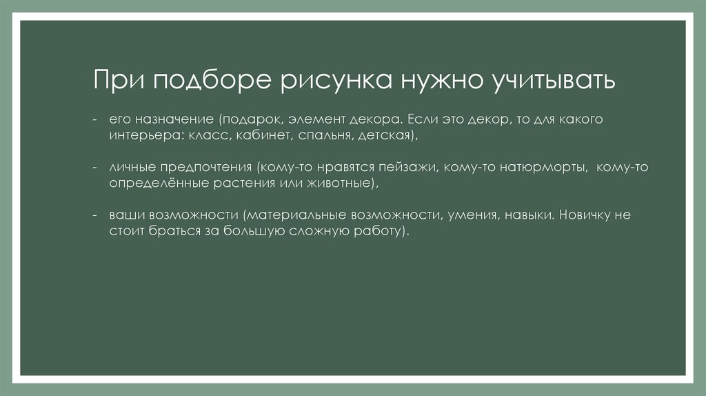 При подборе рисунка нужно учитывать- его назначение (подарок, элемент декора. Если это декор, то для какого