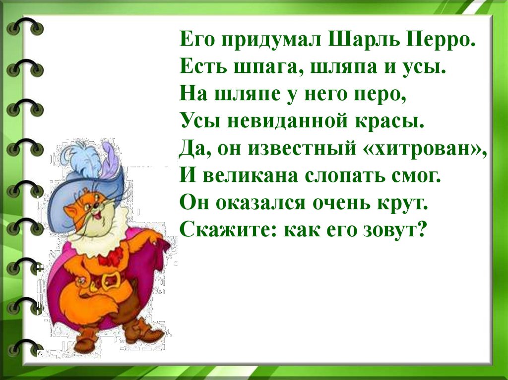 Его придумал Шарль Перро.Есть шпага, шляпа и усы.