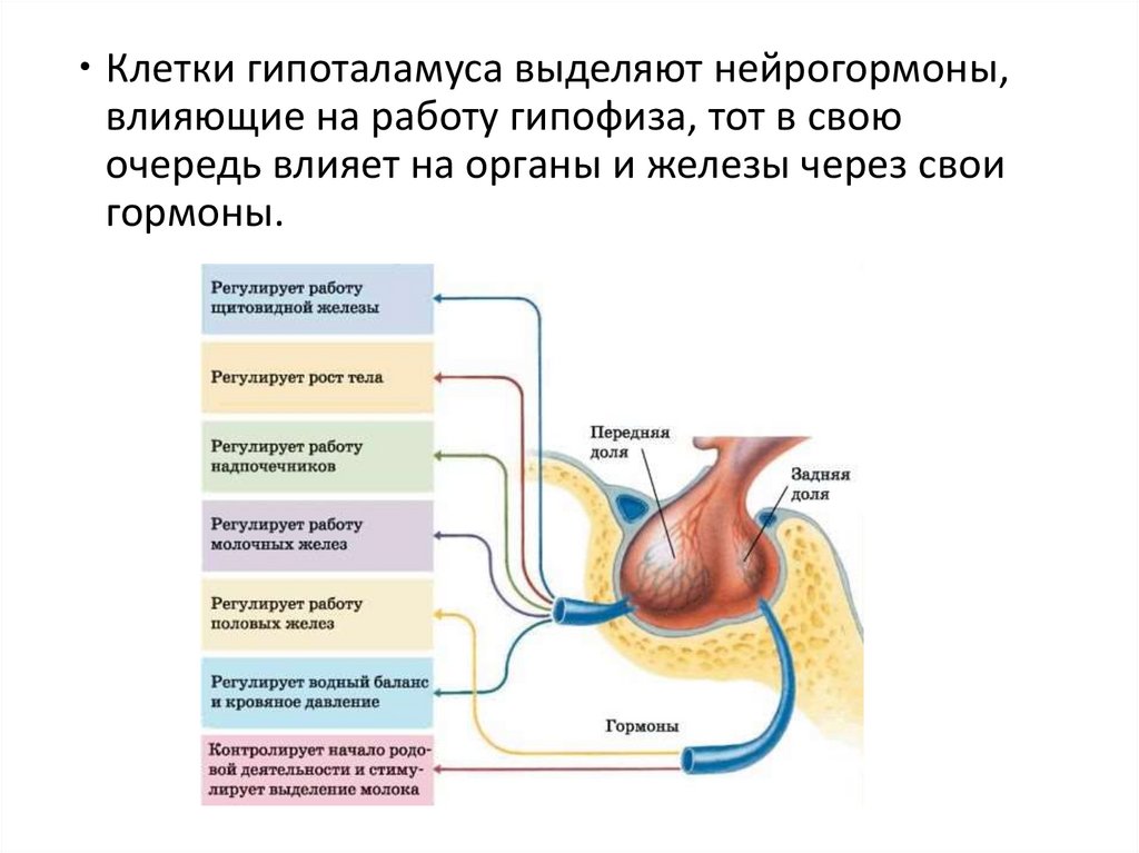 Клетки гипоталамуса выделяют нейрогормоны,влияющие на работу гипофиза, тот в свою