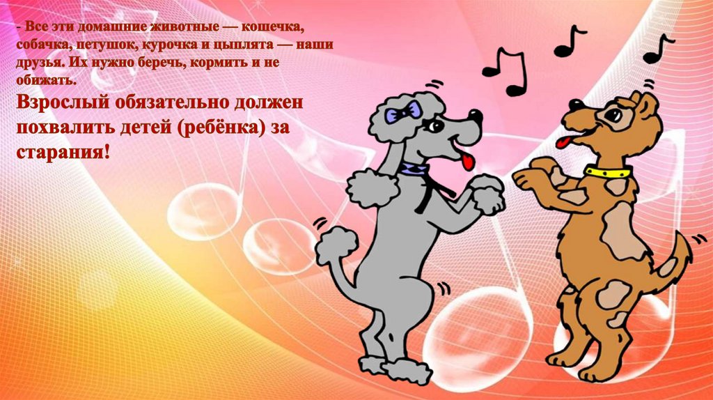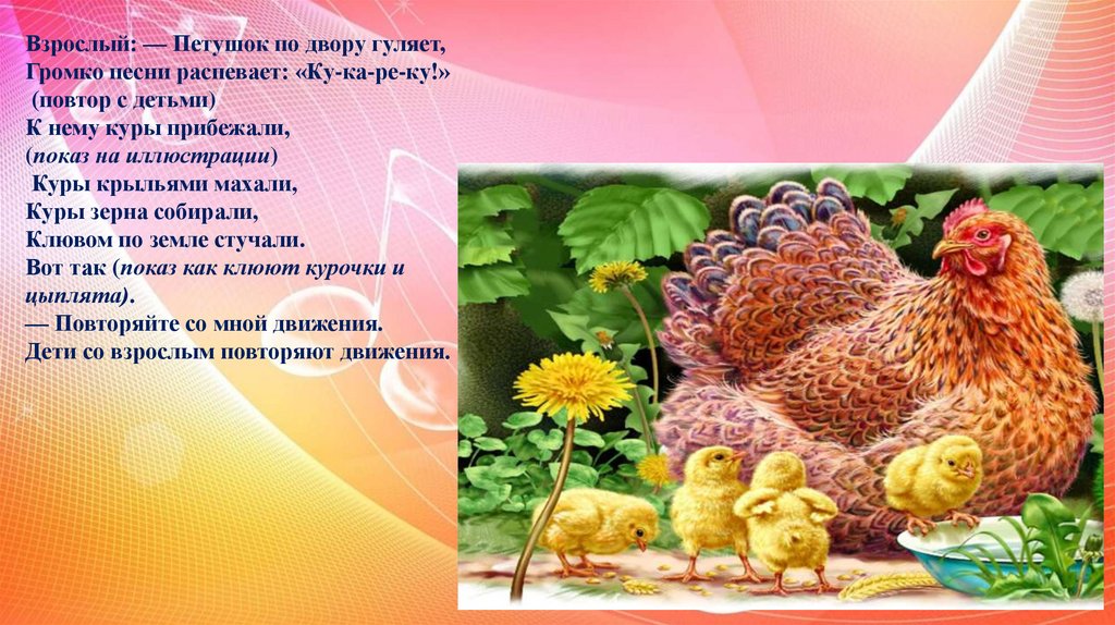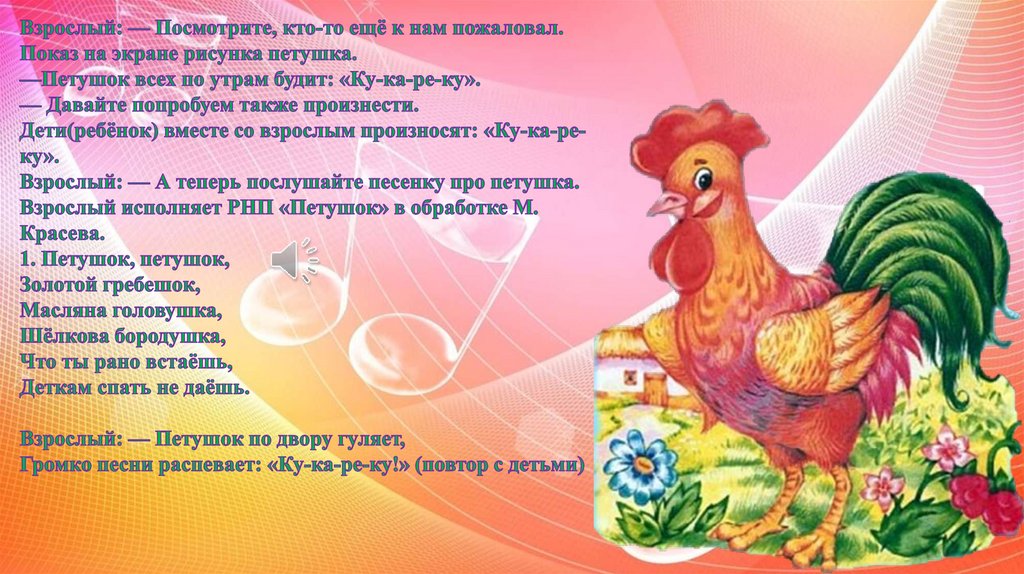 Взрослый: — Петушок по двору гуляет,Громко песни распевает: «Ку-ка-ре-ку!»