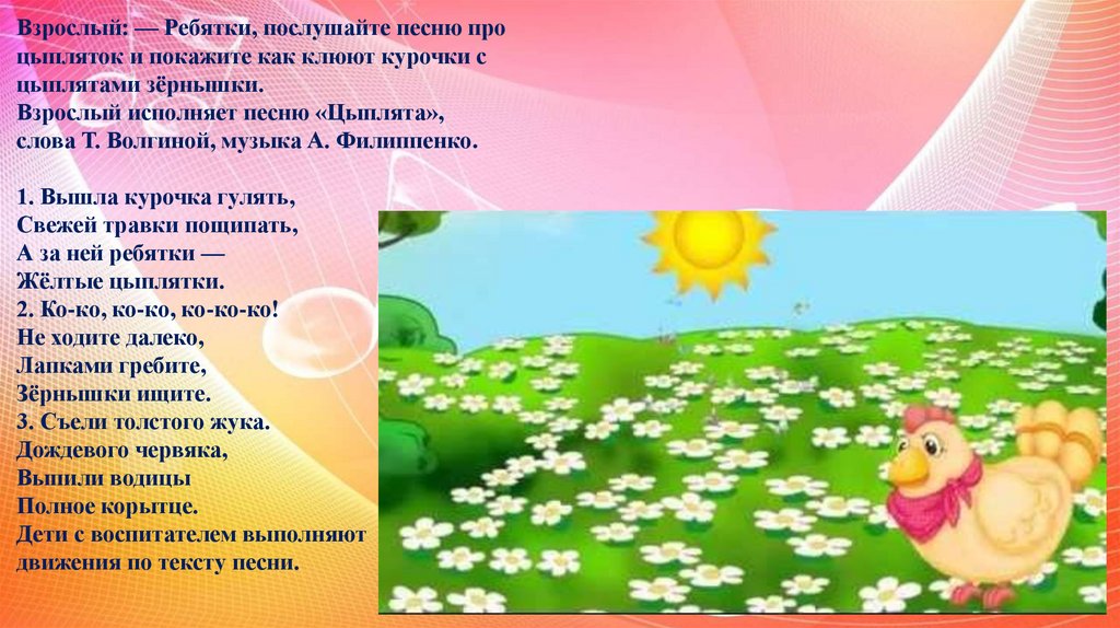 Взрослый: — Ребятки, послушайте песню процыпляток и покажите как клюют курочки с