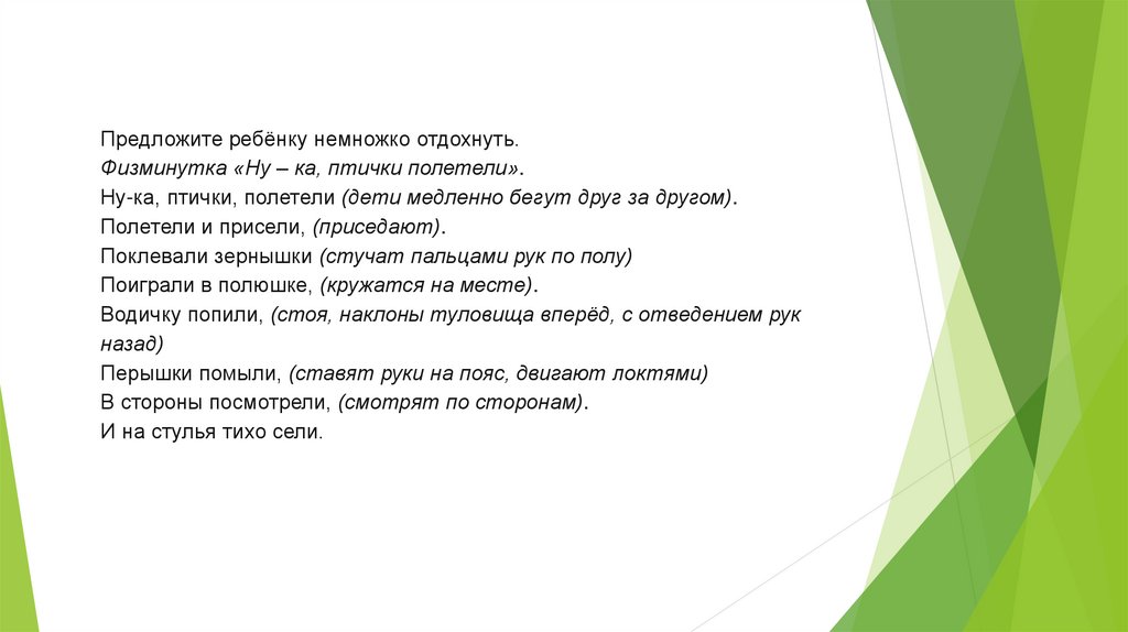 Предложите ребёнку немножко отдохнуть.Физминутка «Ну – ка, птички полетели».