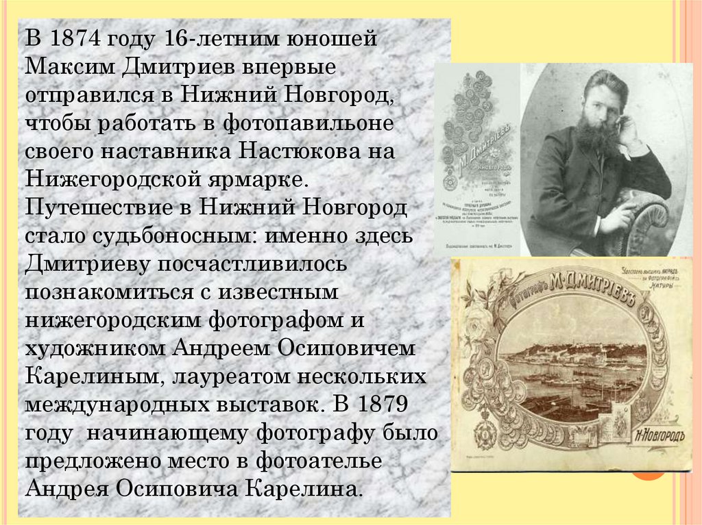 В 1874 году 16-летним юношейМаксим Дмитриев впервые