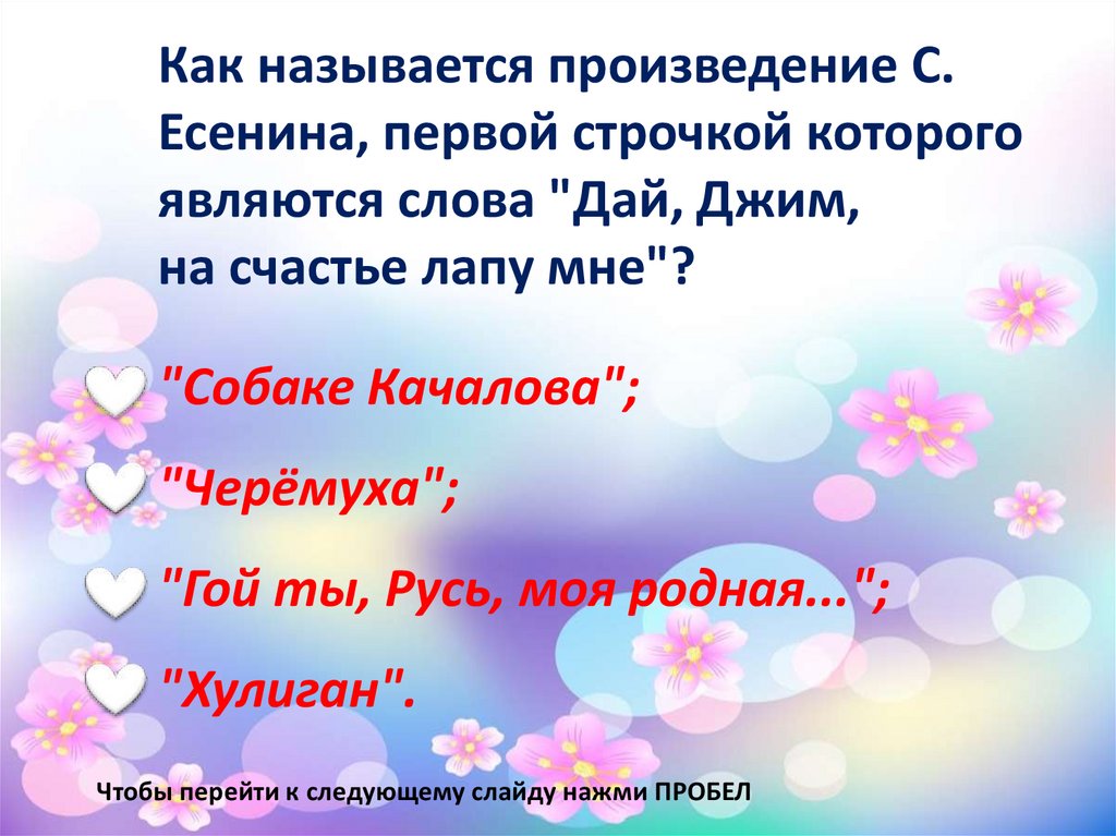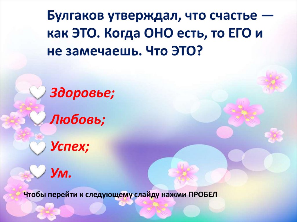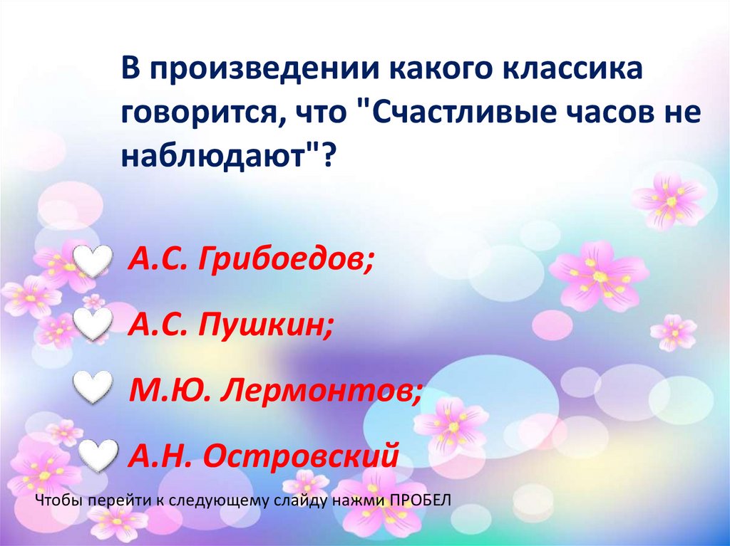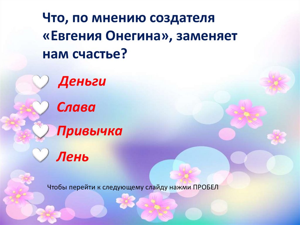 Чтобы перейти к следующему слайду нажми ПРОБЕЛ