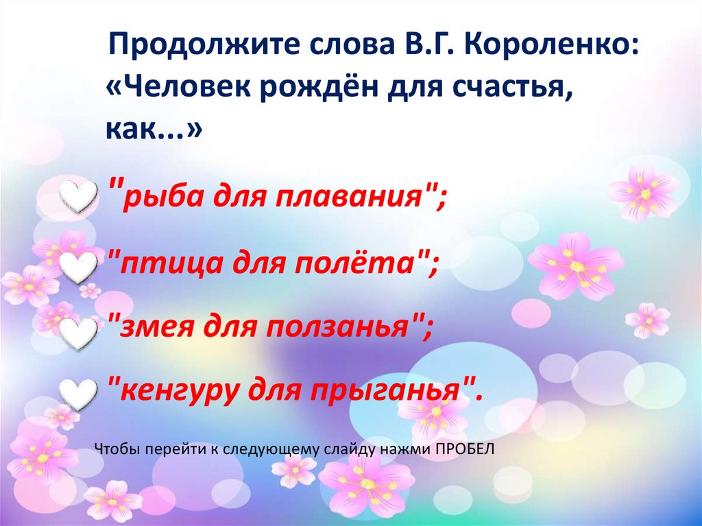 Продолжите слова В.Г. Короленко:«Человек рождён для счастья,