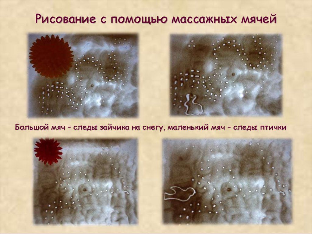 Рисование с помощью массажных мячейБольшой мяч – следы зайчика на снегу, маленький мяч – следы птички
