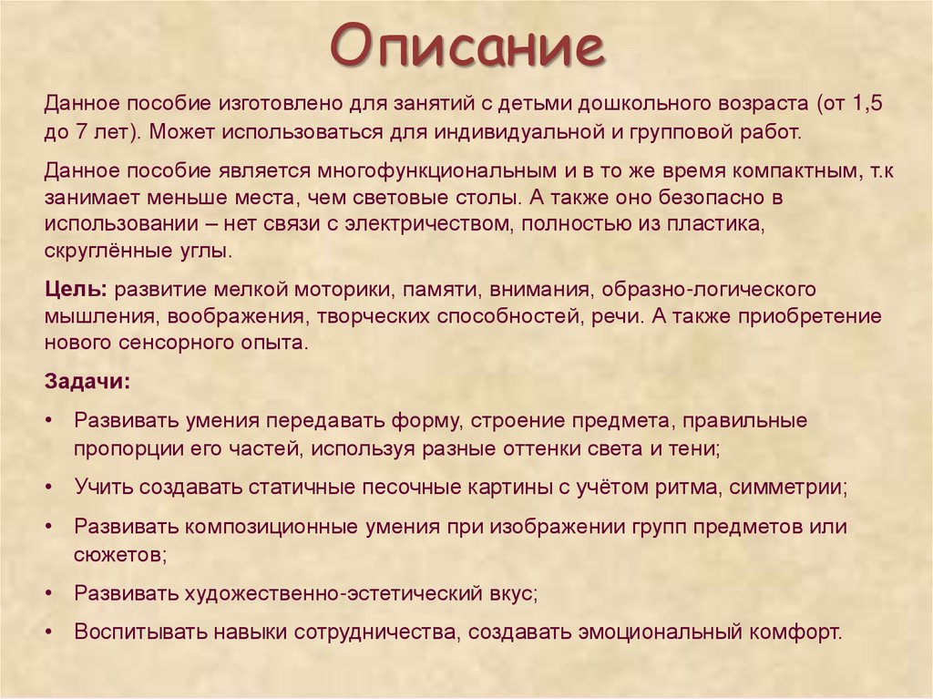 ОписаниеДанное пособие изготовлено для занятий с детьми дошкольного возраста (от 1,5