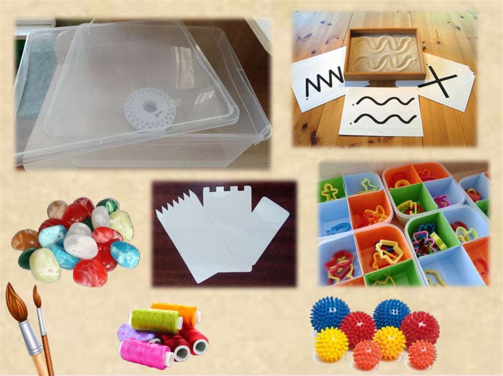 формочки для вырезания, «расчёски» для песка, декоративные камни, кисти,