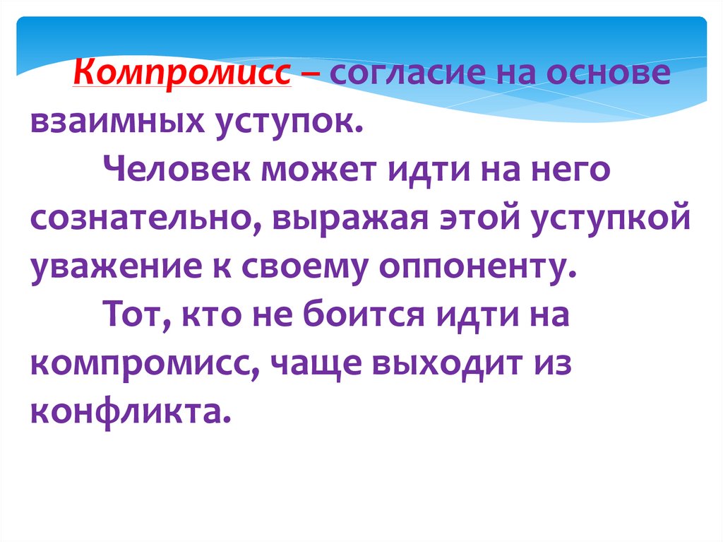 Компромисс – согласие на основевзаимных уступок.