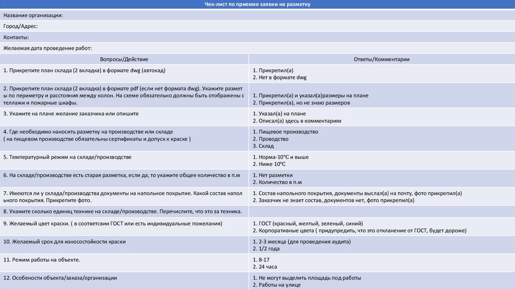 Чек-лист по приемке заявки на разметкуНазвание организации: