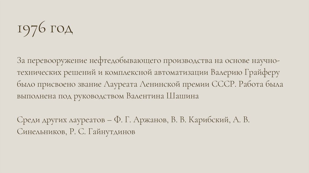 1976 годЗа перевооружение нефтедобывающего производства на основе научнотехнических решений и комплексной автоматизации Валерию Грайферу