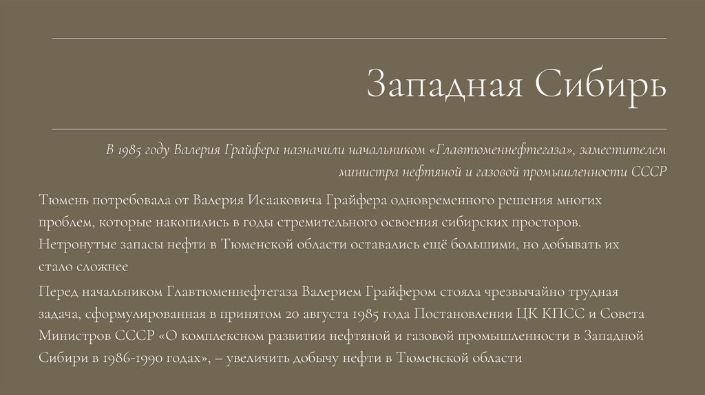Западная СибирьВ 1985 году Валерия Грайфера назначили начальником «Главтюменнефтегаза», заместителем