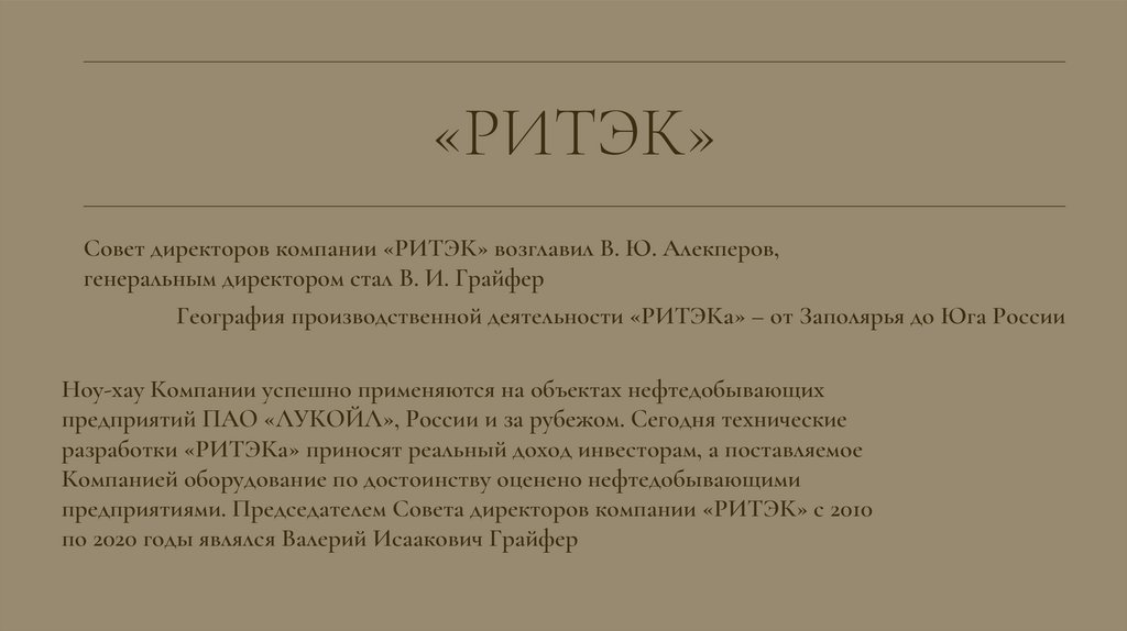 «РИТЭК»Совет директоров компании «РИТЭК» возглавил В. Ю. Алекперов,