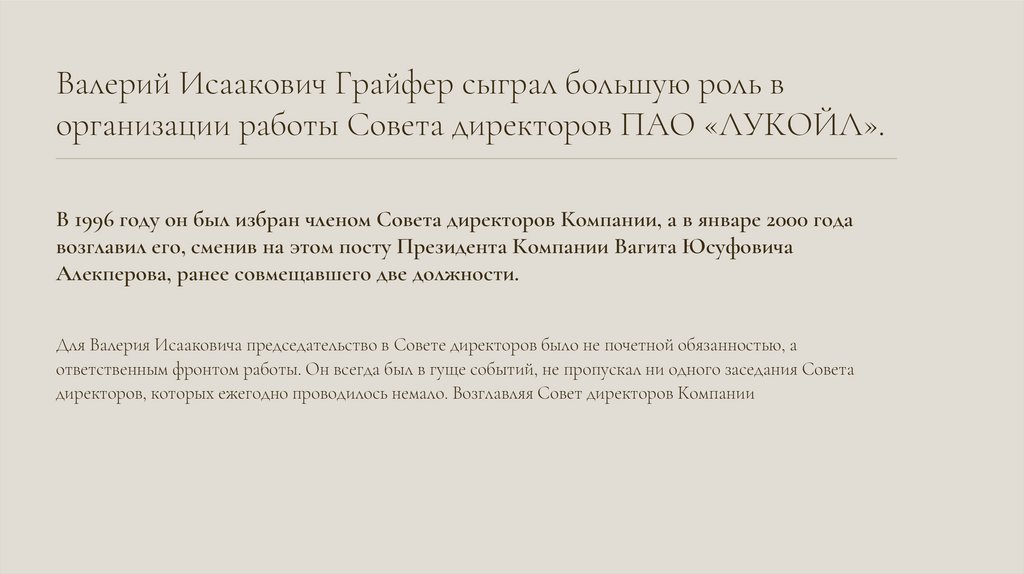 Валерий Исаакович Грайфер сыграл большую роль ворганизации работы Совета директоров ПАО «ЛУКОЙЛ».