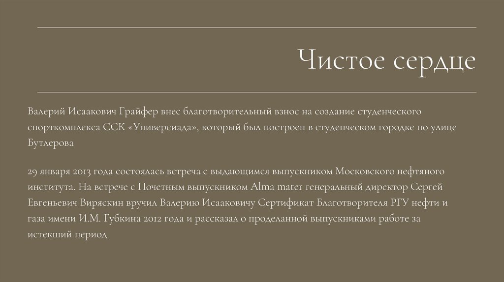 Чистое сердцеВалерий Исаакович Грайфер внес благотворительный взнос на создание студенческого