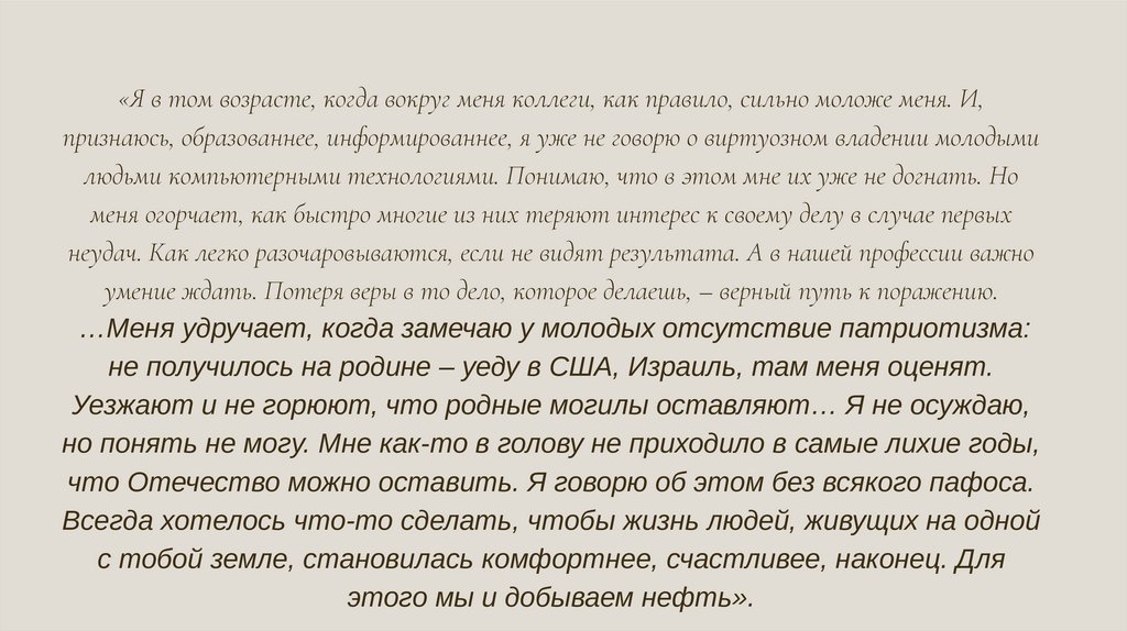 «Я в том возрасте, когда вокруг меня коллеги, как правило, сильно моложе меня. И,признаюсь, образованнее, информированнее, я уже не говорю о виртуозном владении молодыми
